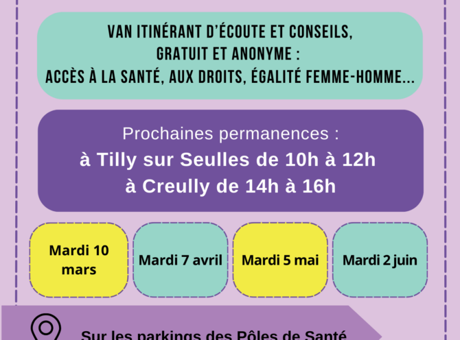 Le Camion des Femmes aide à repérer les situations de violences conjugales/intrafamiliales et effectue des opérations de sensibilisation (santé, droits, égalité femmes-hommes, insertion professionnelle, vie affective, etc.). Les permanences mensuelles du Camion des Femmes se déroulent à Tilly-sur-Seulles et à Creully-sur-Seulles, sur les parkings des pôles de santé de Seulles Terre et Mer. Il est utile de préciser que, malgré l’intitulé, le Camion des femmes accueille sans distinction les femmes et les hommes.