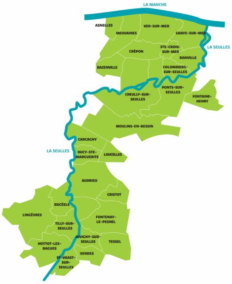 Géographiquement, la rivière La Seulles et ses méandres dessinent la colonne vertébrale d’une collectivité longitudinale. Vingt-sept communes rurales émaillent la plus petite intercommunalité du Calvados, en termes de population, soit 17 094 habitants (INSEE 2023). Le siège administratif de Seulles Terre et Mer est implanté dans la cité médiévale de Creully-sur-Seulles.