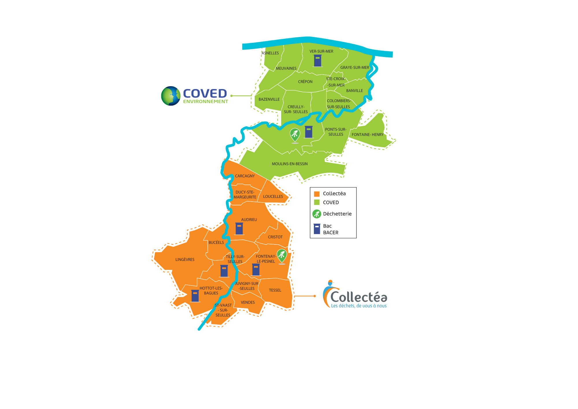 La collecte des déchets de Seulles Terre et Mer se répartie en deux zones par deux prestataires différents.